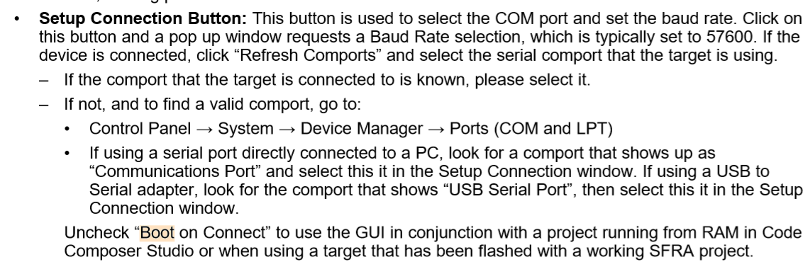 我实现完了,连接SFRA_GUI.exe,结果是这样的。顺便问下,setup里面的boot on connect是做什么用的呢?似乎要输入一个.a00文件。