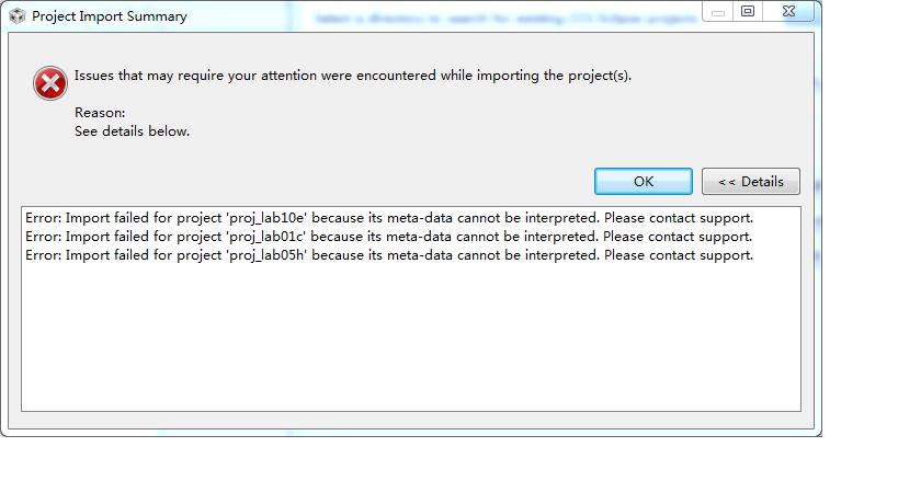 Error:Import failed for project 'proj_05h' because its meta-data cannot be interpreted. Please contact support.