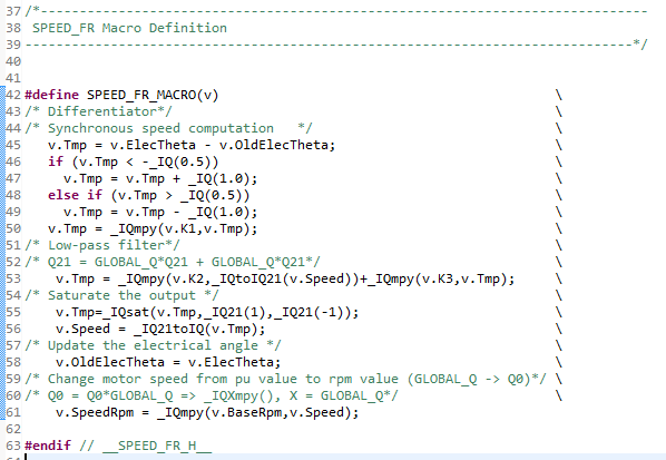 // Initialize the Speed module for QEP based speed calculationspeed1.K1 = _IQ21(1/(BASE_FREQ*T));speed1.K2 = _IQ(1/(1+T*2*PI*5));// Low-pass cut-off frequencyspeed1.K3 = _IQ(1)-speed1.K2;speed1.BaseRpm = 120*(BASE_FREQ/POLES);