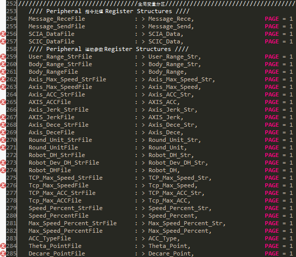程序应用:计算每个变量(包括结构体变量,数组变量等)在地址段中的空间大小,根据空间大小的值在F28335.cmd文件MEMORY的PAGE 1中按顺序定义每个变量的初始地址和长度(存在zone7中且地址无重叠,每段地址空间与变量所需空间严格相同,没有一点点浪费),同时在SECTIONS中对各段地址进行变量映射,并在.c文件中通过#pragma DATA_SECTION语句对变量进行定义(一切应该都是这么完美),但是……