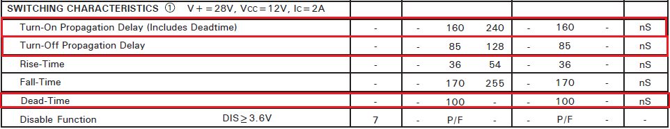 可以看出,该器件的开通延迟及关断延迟都很小,是纳秒级的;有100nS固定的死区时间,用户在使用时实际的PWM频率为24KHz。