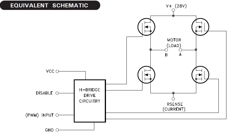 上图为器件结构图,该器件只有一个PWM信号输入参与电机调速,当占空比为50%时电机停止,占空比大于50%小于100%电机正转,占空比小于50%大于0%电机反转。Disable信号是器件的shutdown信号,不参与调速控制。