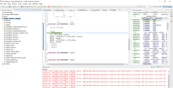 单步执行操作时,CLA_0: Can't Single Step Target Program: (Error -2060 @ 0x0) Requested operation cannot be done while device is running. Halt the device, and retry the operation. (Emulation package 5.1.450.0)