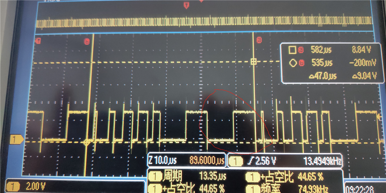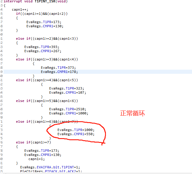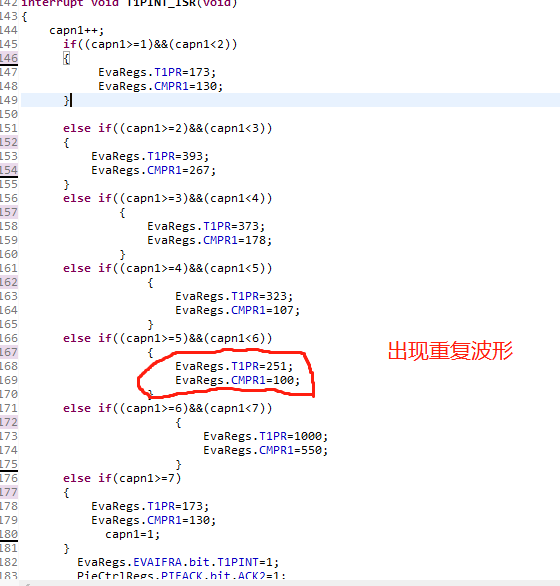 我是刚刚开始学习DSP,对于这方面的配置理解不是非常透彻,我最近要写一个程序,目的是实现输出的PWM波形按照规律循环变化周期和占空比。我的思路是在周期中断内每次重新给周期寄存器和比较寄存器赋值。现在遇到一个很奇怪的现象,我每次只需要6个循环,但是实际输出波形中可以发现,最后一个周期的波形出现了两次,也就是出现了7个周期。同样的我把第五个周期值设置大一点,这种现象就会消失。这两者之间的区别就是第5个的周期设置不同,其他地方完全一样。请问这是为什么呢?是不是因为周期寄存器值太小导致这个现象呢?