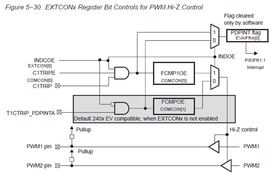 当EvaRegs.EVAIMRA.bit.PDPINTA位为1时,故障条件产生时,PWM为高阻;