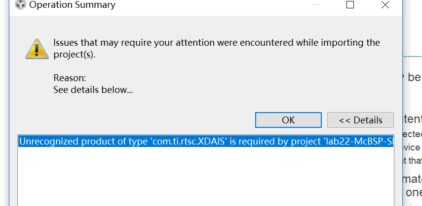 上图的detail的内容:See details below… Unrecognized product of type 'com.ti.rtsc.XDAIS' is required by project 'lab22-McBSP-SPI-LOOKBACK' – please install at least one product of this type before building this project.