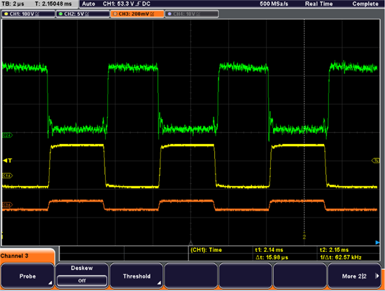 请问如何测量LLC谐振开发套件的原边谐振电流波形,我做过如下尝试:1.如图1所示,我将电压探头夹在PCB板的Ip-cs点上,测出来的波形如图2所示(3通道橘色波形为Ip-cs处波形),为何不是正弦波?2将电压探头夹在T3的1和6脚测出的波形如图3的绿色波形所示,这是正弦波吗?怎么波形不平滑。